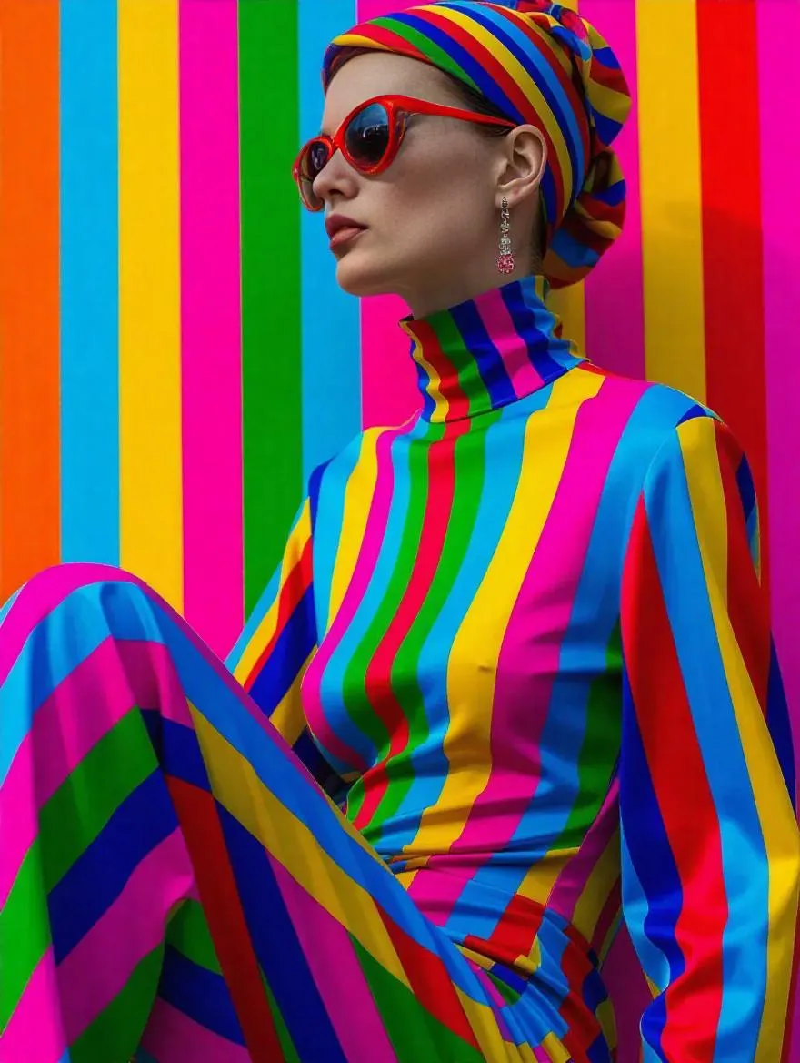 Transform text into stunning AI art with vivago.ai. Generate surreal vector-striped sculptures of futuristic women, blending vibrant abstract colors (blue, green, yellow, purple, red) and architectural fashion designs. Elevate creativity with AI-powered tools for professional-grade surreal visuals, dynamic striped backgrounds, and avant-garde artistry in every image.