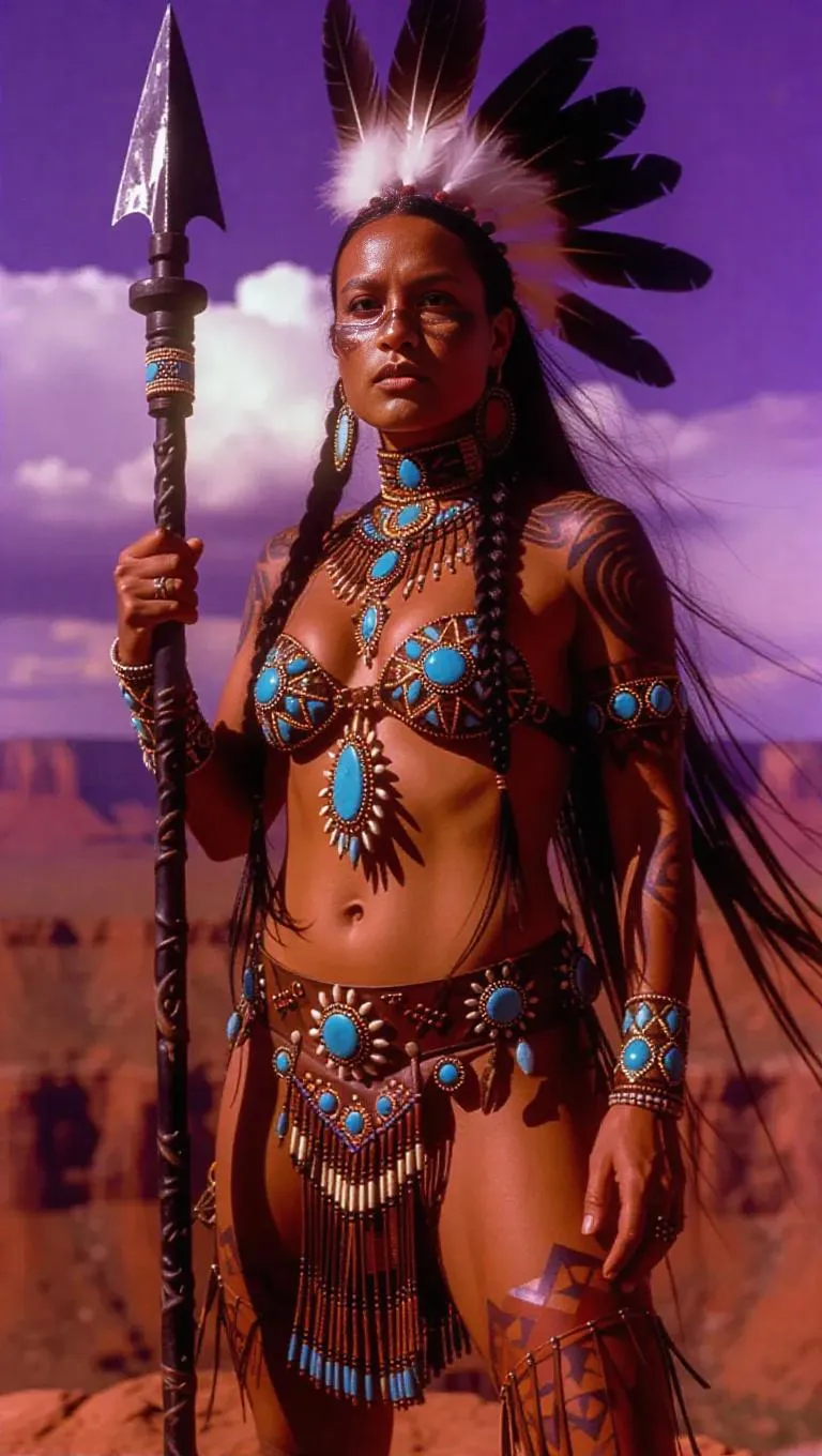 Proud Native American warrior woman stands defiantly atop crimson canyon mesa, adorned in beaded leather bikini with tribal tattoos and eagle feathers. Grips glowing ancestral spear against stormy violet sky with thunderbirds. 35mm film grain, dynamic shadows, shallow depth-of-field intensify her amber-eyed battle-ready stance. AI-generated art capturing traditional strength and cinematic drama.