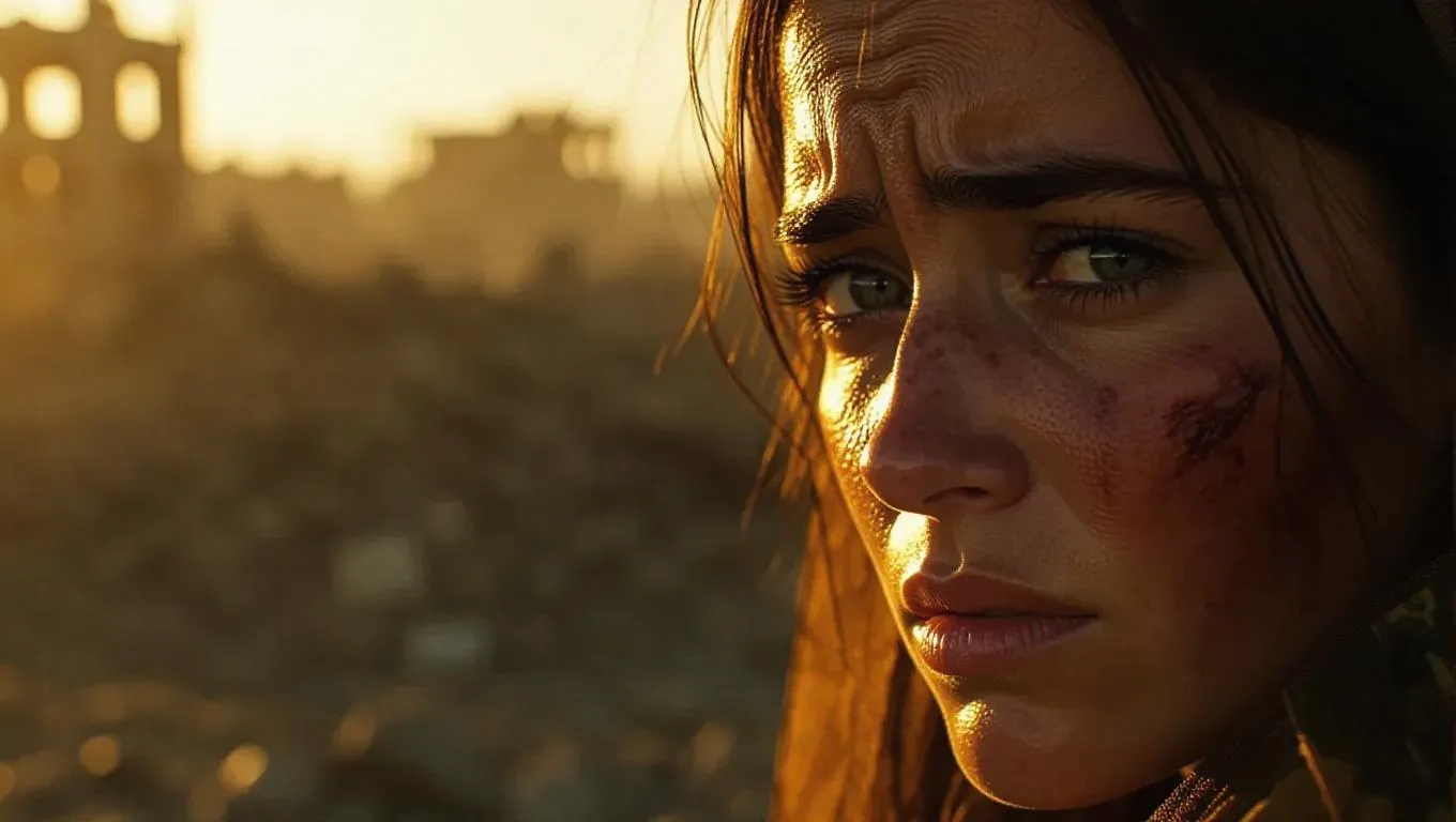 A war-torn woman's face, displaying an intense and sorrowful expression, dominates the frame, her eyes reflecting the horrors of conflict. In the background, destruction sprawls, with ruined buildings and debris scattered, golden sunlight casting long shadows. A shallow depth of field, achieved with a wide-aperture lens, blurs the devastation, drawing focus to her traumatized features. Her skin appears pale, with fine lines etched on her forehead and around her eyes, tears welling up. The image is rendered in a hyper-realistic, cinematic style, illuminated by soft, natural light, using a full-frame camera with a 50mm lens.