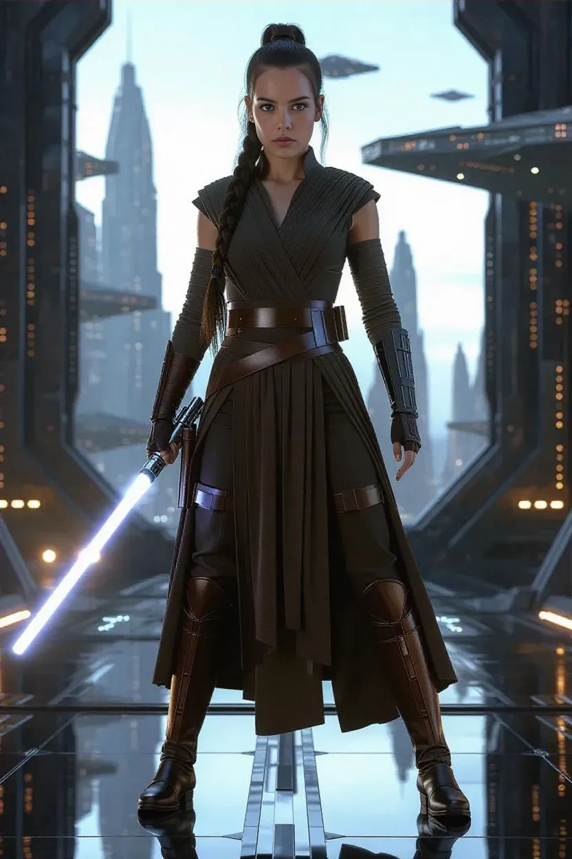 Craft dynamic Star Wars AI art with an athletic female Jedi in futuristic sci-fi landscapes. Ultra-realistic 8K resolution showcases intricate brown robes, gleaming white lightsaber, and cinematic lighting. AI-powered effects render durasteel structures, holographic interfaces, and hovering starships. Elevate visuals with heroic readiness, textured details, and professional-grade realism. Transform prompts into lifelike, epic scenes instantly. #VivagoAI