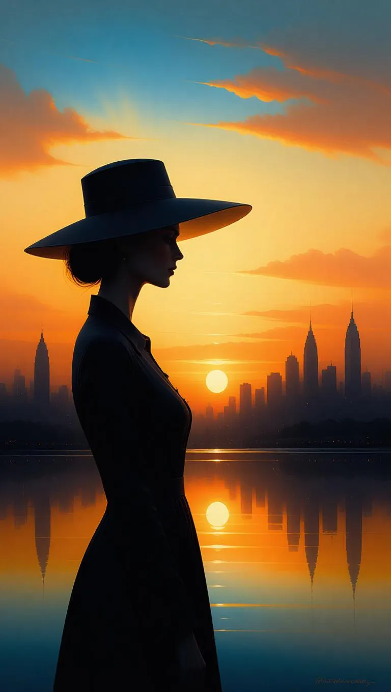 Create a serene AI-generated abstract painting of a woman's silhouette in a large hat against a sunset city skyline. Earthy browns and oranges blend with vibrant blue waters, evoking peaceful artistry. Transform text to stunning visuals with VivaGO's AI image tools for professional-grade creative results.