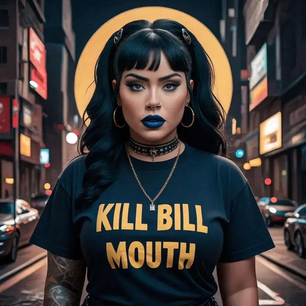 Generate a bold AI image of a Hispanic/Black thick goth woman with retro 80s hip hop flair, blending "Kill Bill" aesthetics. Featuring black mixed-texture hair, edgy "Kotton Mouth" graphic tees, and cinematic streetwear vibes. Perfect for avant-garde visual storytelling with VivaGo's AI image generator and creative effects tools.