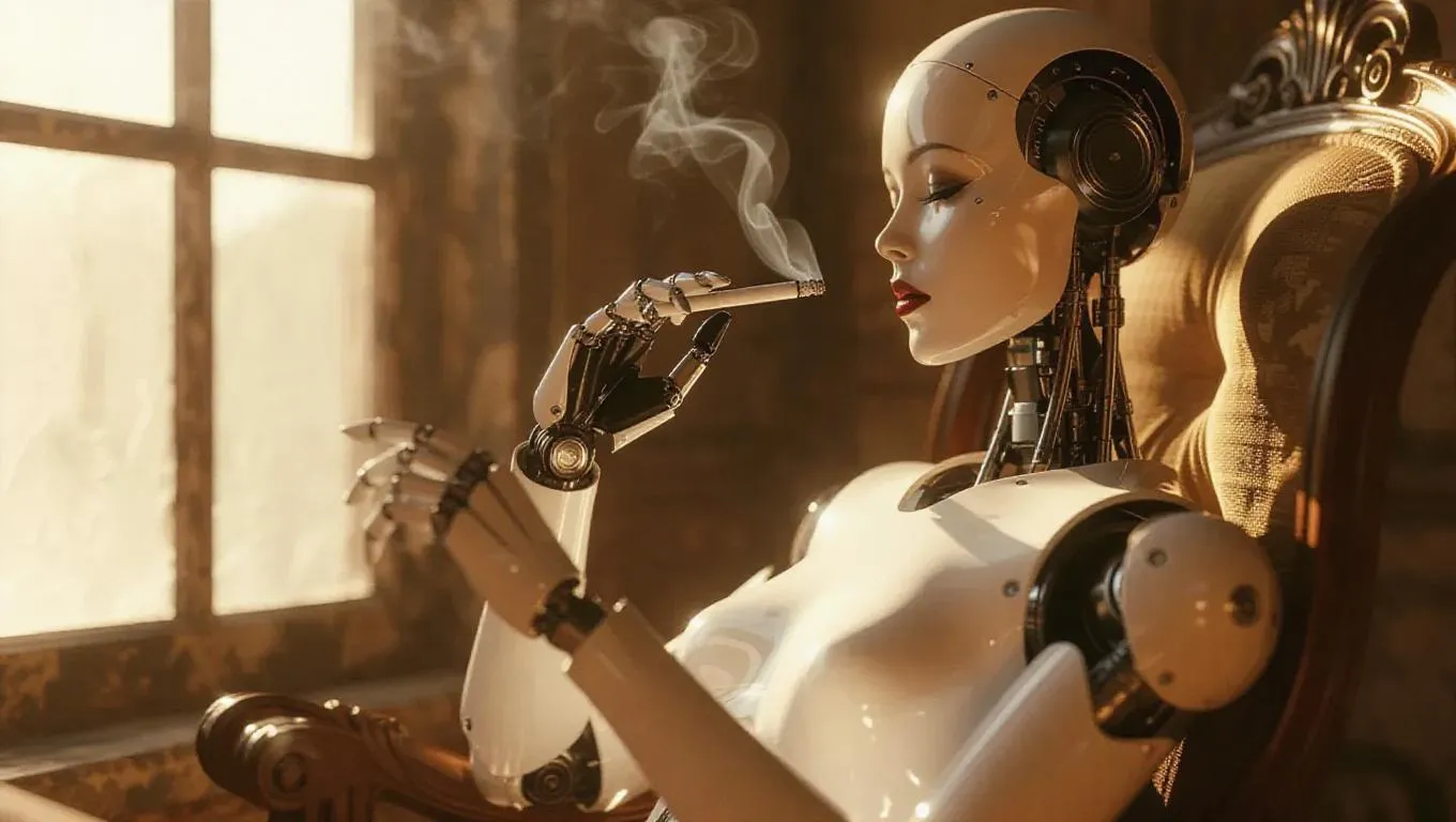 Visualize a serene AI robot smoking in a sunlit room with cinematic detail. Vivago.ai crafts lifelike AI-generated imagery, blending technology and atmosphere for captivating visual storytelling. Explore AI effects for realistic smoke, dynamic lighting, and subtle motion in creative AI content.
