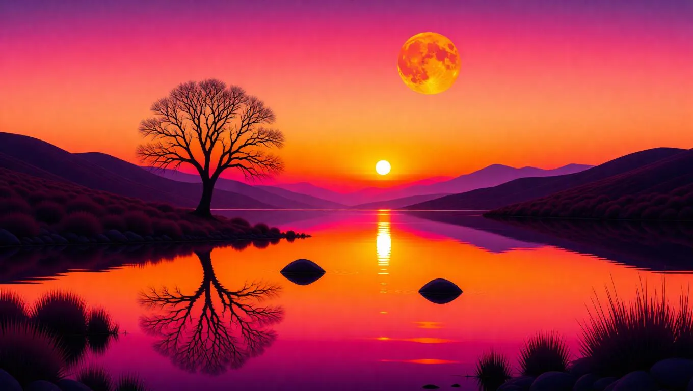 Create stunning AI-generated landscape paintings with serene sunset scenes. Vivago.ai transforms text prompts into vivid gradient skies of orange, pink, and purple, tranquil water reflections, and peaceful nature imagery. Craft your own atmospheric artwork featuring lone trees, calm waters, and vibrant celestial hues effortlessly. Perfect for digital artists seeking AI-powered serenity.
