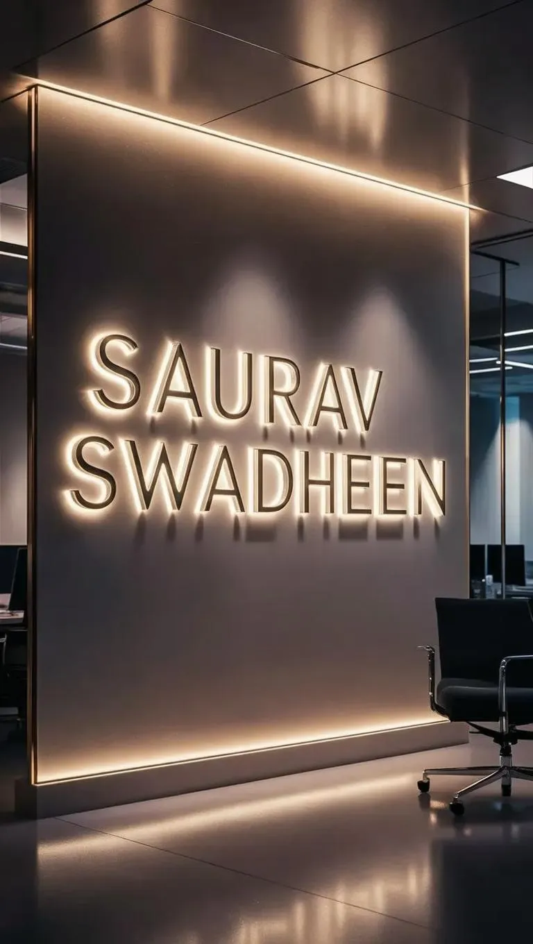 Create a hyperrealistic photo of "Saurav Swadheen" company name with a backlit acrylic logo on a minimalist wall. Pixar-inspired cinematic style meets magic realism, blending photoreal precision with National Geographic's immersive cinematography. Sophisticated modern design for professional branding, interior visuals, and immersive film photography.