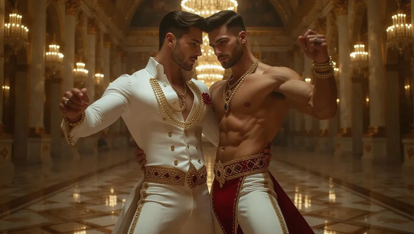 Majestic English king and boyfriend dance in a lavish gold, pearl, and ruby-adorned ballroom. Both flaunt chunky gold jewelry, traditional regal attire, and fitted garments highlighting their muscular builds. HD realism captures their love, pride, and the opulent Renaissance-inspired interior. AI-generated vibrant, high-quality image merges historical grandeur with modern LGBTQ+ representation.
