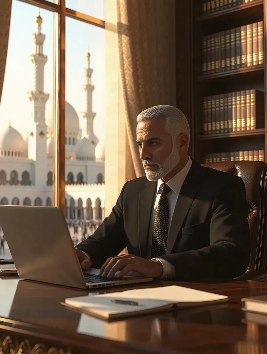Generate a realistic AI animation of an Egyptian businessman working intently in his Mecca office. Capture the iconic Kaaba view through a large window, lush golden daylight, sleek wooden desk, and a professional ambiance. Vivago.ai crafts detailed, serene business scenes with powerful AI tools.