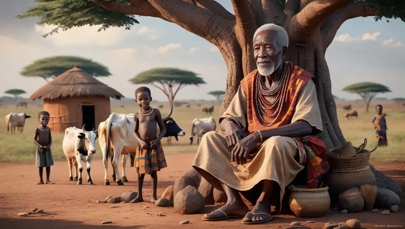 Generate a vivid African village scene featuring an elderly man in traditional attire under a tree, his weathered face reflecting wisdom. Children play joyfully amid roaming livestock, capturing authentic rural life. Crafted in 8K resolution, this AI-generated image blends cultural richness, dynamic details, and lifelike textures for professional-grade visual storytelling.