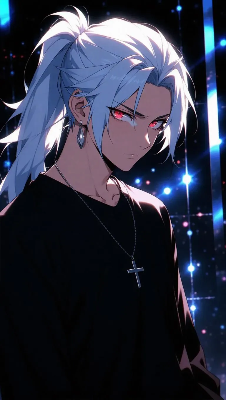 Anime shonen style, earings, necklace, mature charming boy 25 year old, bored expression, wild white short messy hair, long white lower pony tail in the back, Glowing red eyes, reptilian eyes glowing , He wears a Slim, long-sleeved black fitted Tshirt, dark background with mirrors