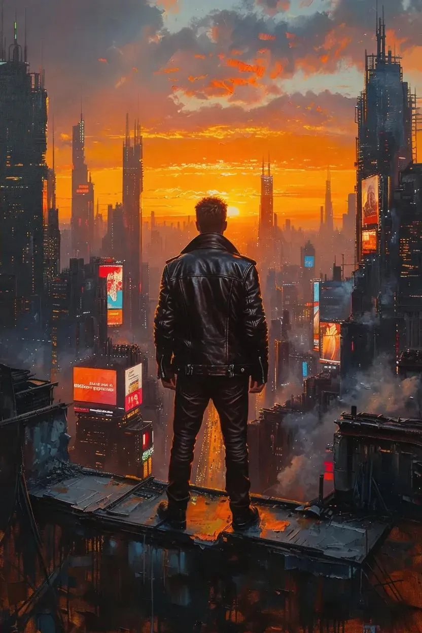 Explore AI-generated dystopian cityscapes with this atmospheric oil painting masterpiece. Neon-lit skyscrapers, fiery sunsets, and a lone figure in a leather jacket gazing from a crumbling rooftop. Textured oil pigments blend with soft brushstrokes to depict desolate urban landscapes. Transform text prompts into visual masterpieces using VivaGo.ai's AI art tools.