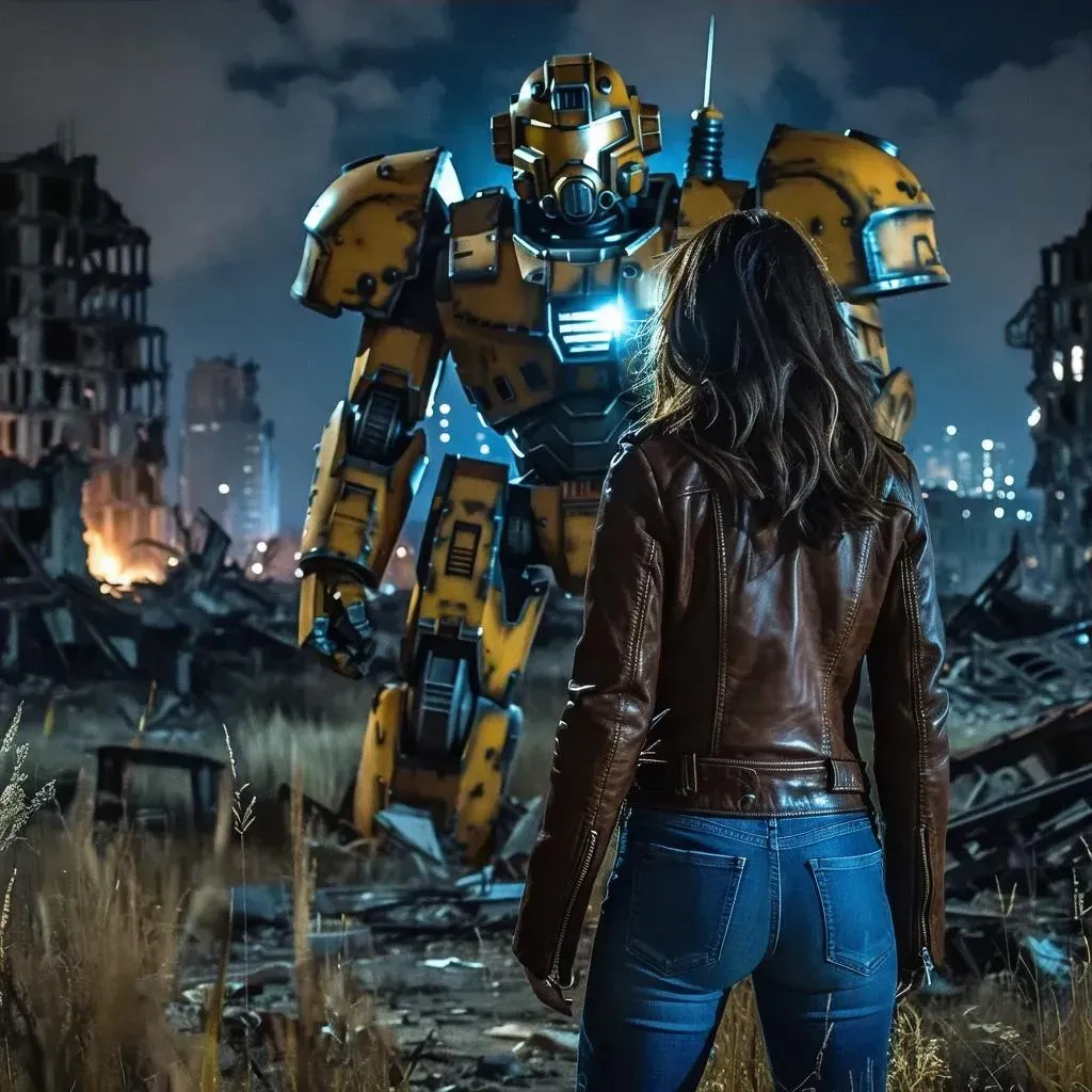Dramatic apocalyptic night scene with Fallout Power Armor confronting a shadowy brunette in leather jacket. Silhouetted ruins, cinematic lighting, motion blur, and ultra-HD V-Ray rendering intensify post-apocalyptic action. Ideal for immersive storytelling, AI-generated dystopian visuals, and high-resolution digital art with dynamic combat energy.
