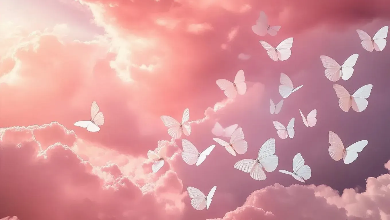 Generate a realistic AI image of swirling white butterflies in stormy skies with a vibrant pink backdrop and glowing aura. Create captivating, high-quality surreal visuals using vivago.ai's AI art tools for ethereal nature scenes, digital art projects, and professional creative designs.
