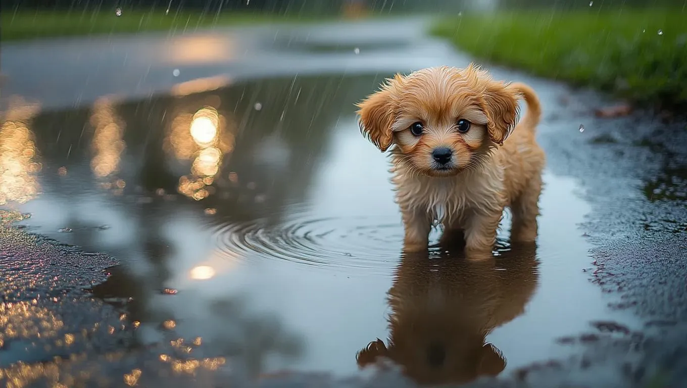 Create stunning AI-generated visuals of Penny, a fluffy golden puppy with big, curious eyes, in a serene rainy scene. Reflective puddles, misty skies, and soft ripples blend AI artistry with nature's calm, perfect for pet lovers seeking emotive, professional-grade digital art.