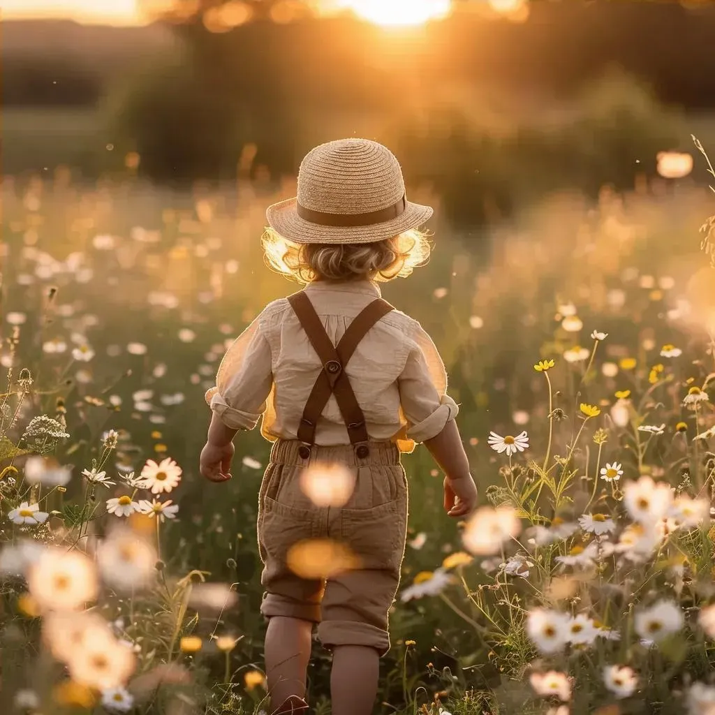 Create a nostalgic AI-generated image of a child in suspenders exploring a golden-hour meadow with wildflowers. Vivago.ai crafts ethereal, film-style visuals using soft focus, muted tones, and shallow depth to evoke rustic countryside innocence and serene childhood wonder through text-to-image magic.