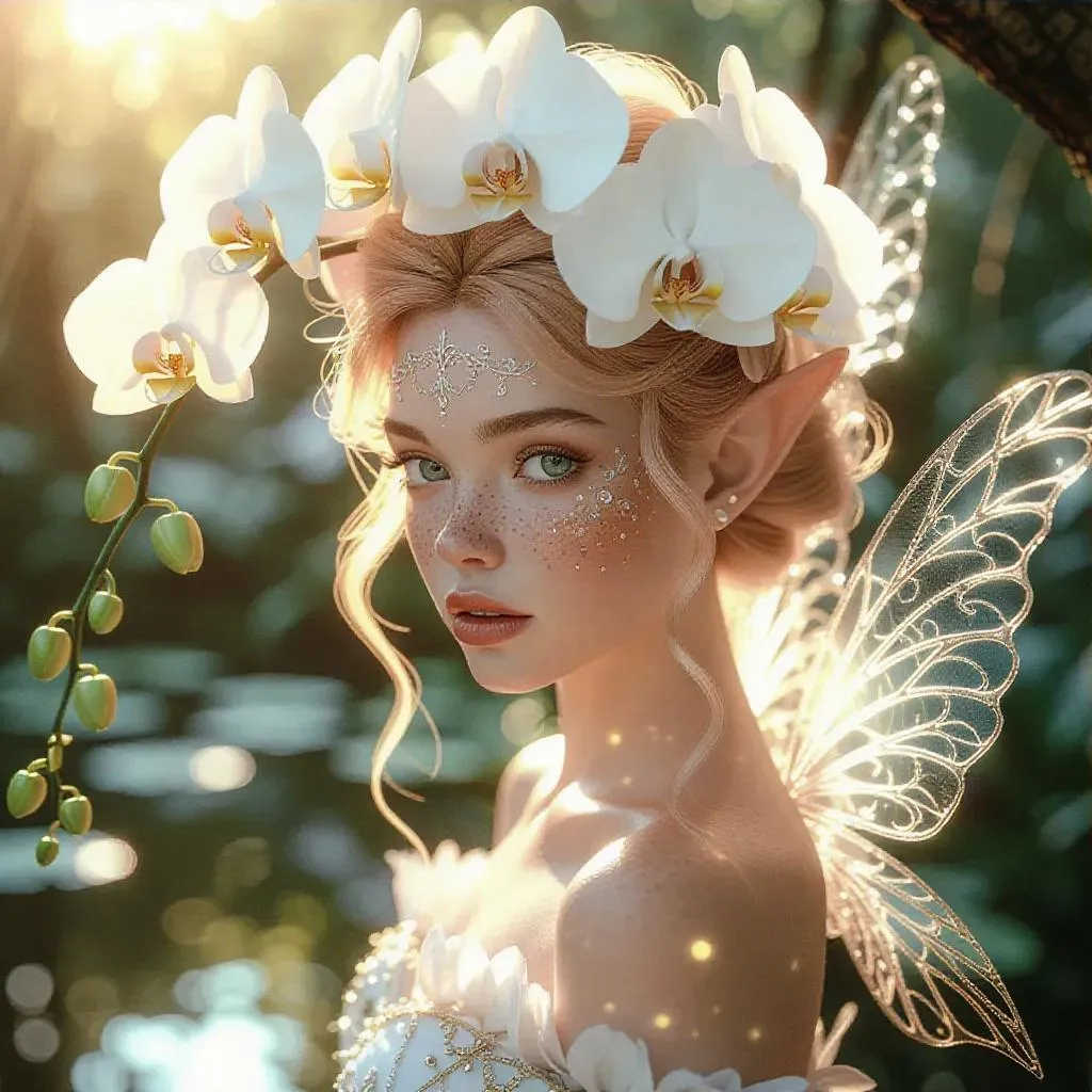 Create AI-generated fantasy art of an ethereal orchid fairy princess with intricate wings, porcelain skin, and a magical aura. Set in an enchanted forest with glowing fireflies, serene ponds, and dappled sunlight. Transform text prompts into professional-grade visuals with Vivago.ai's AI image generator for ethereal, detailed fantasy character designs.