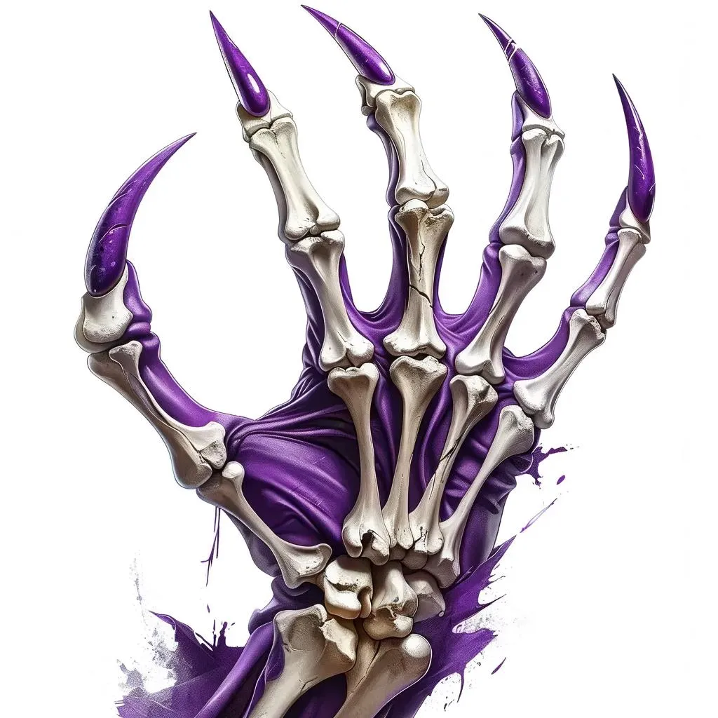 Create a cartoon-style AI effect of a purple hand with bone claws between fingers on a white background. Transform text prompts into striking visuals using our AI image generator for creative, professional-grade results.