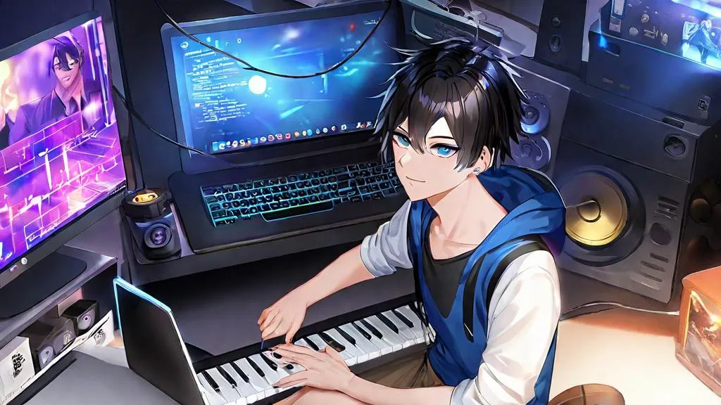 Create anime-style music creator scenes with Vivago.ai's AI art generator. Generate vibrant visuals of passionate musicians in cozy studios, featuring dynamic soundwave animations and cluttered creative spaces. Perfect for anime-inspired character design and music production imagery. Transform text prompts into warm, energetic artworks showcasing tech-savvy artists crafting beats in neon-lit home studios.