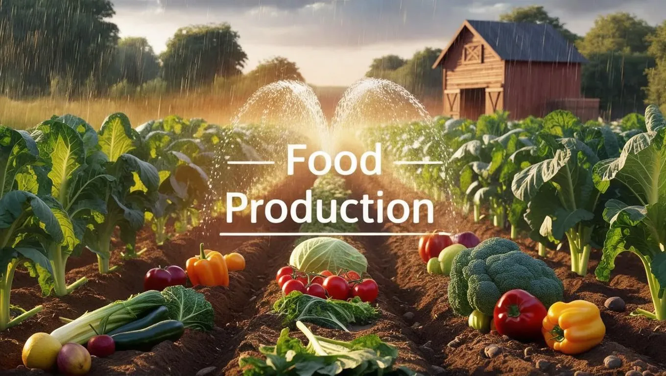 Generate AI visuals of food production with "Food Production" centered, showcasing vibrant fruits and vegetables being watered. Highlight sustainable farming, fresh produce growth, and agricultural technology. Ideal for eco-friendly branding, educational content, or promoting farm-to-table concepts with vivid, AI-crafted imagery.