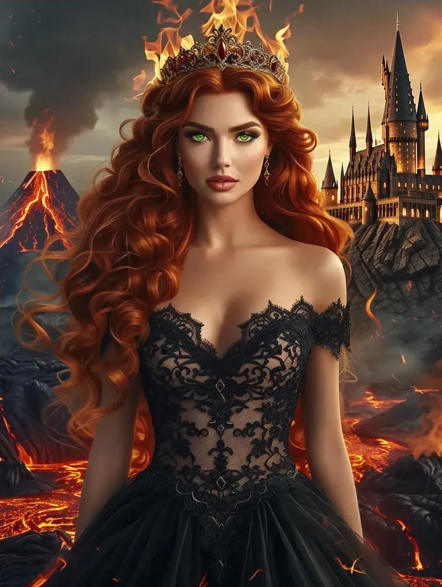 Generate mesmerizing AI art of a fiery queen with blazing crown, red hair, and emerald eyes, adorned in black lace gown and stilettos. Craft volcanic landscapes with brimstone castles, lava rivers, and erupting volcanoes using Vivago.ai's AI image generator. Ideal for fantasy visuals, dramatic character design, and immersive AI-enhanced environments.