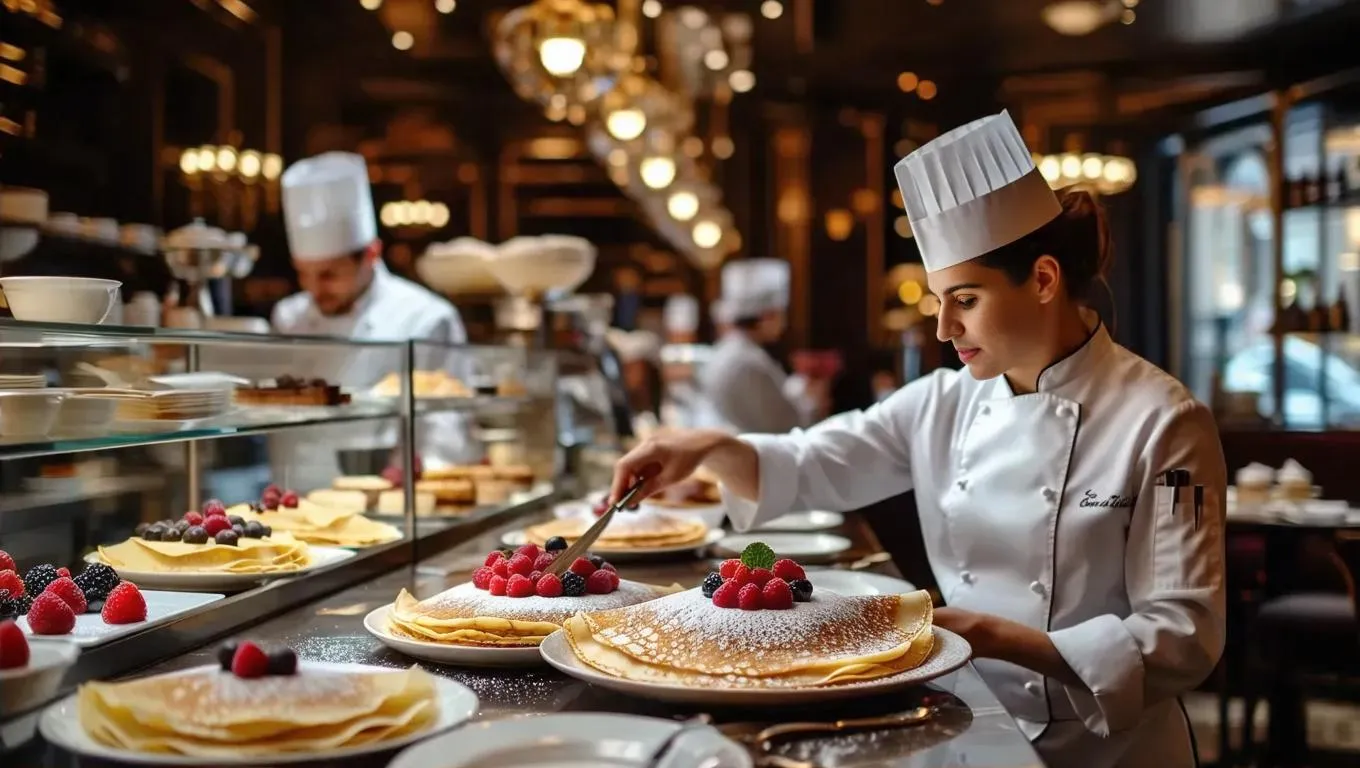 Experience a bustling five-star crepe café with AI-generated visuals. Chefs flip golden crepes, garnish with fresh fruits & chocolate drizzle amid elegant tables and warm lighting. Ambient chatter and classical music enrich this cozy, luxury scene—perfect for foodie content. Crafted by vivago.ai’s AI tools for immersive culinary storytelling.