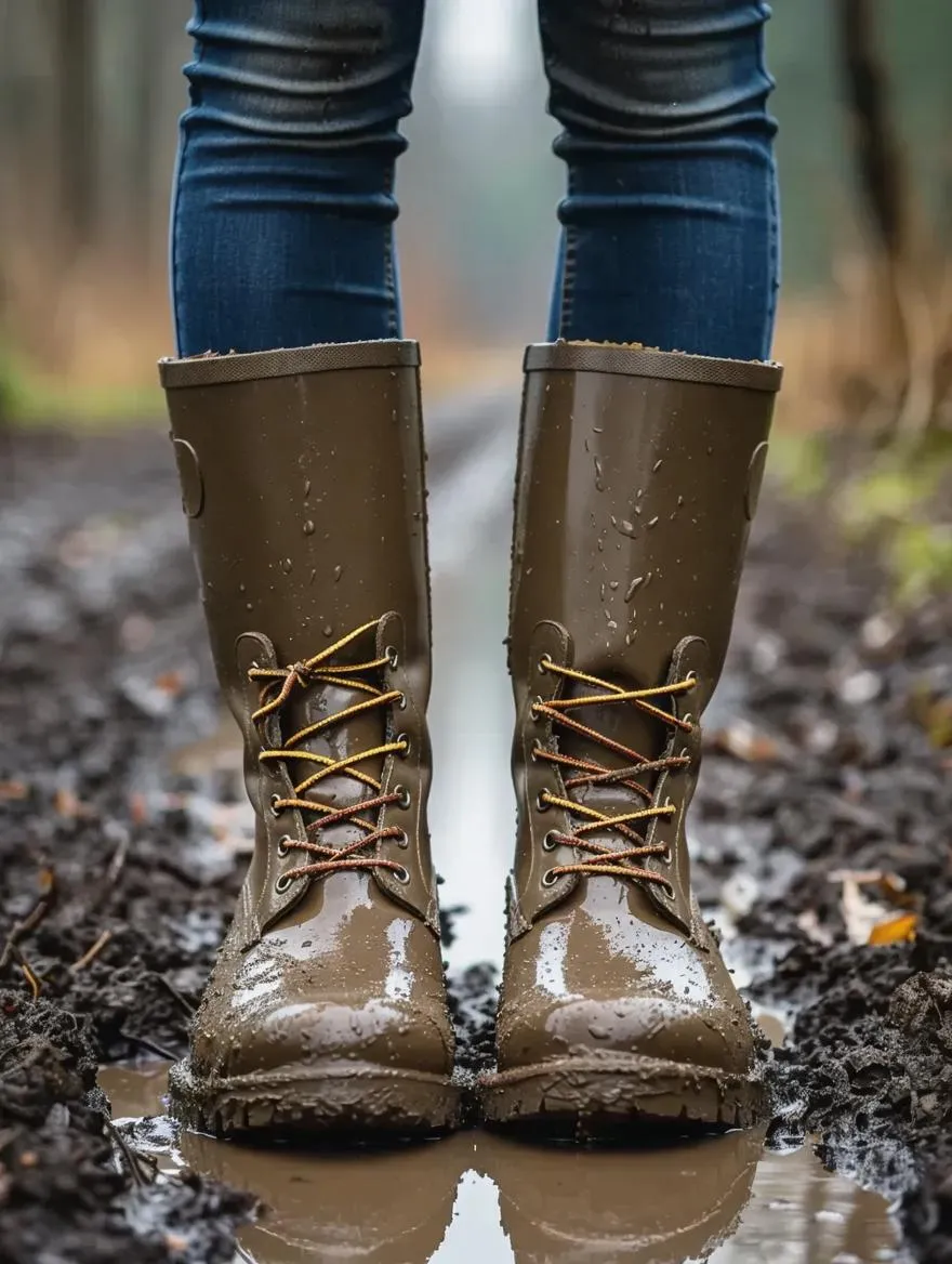 Generate realistic AI images of women's muddy rubber boots in front view. Perfect for outdoor gear visuals, showcasing detailed texture, mud splatters, and waterproof design. Enhance content with lifelike AI-generated footwear for ads, product pages, or creative projects. Vivago.ai delivers professional-grade results.