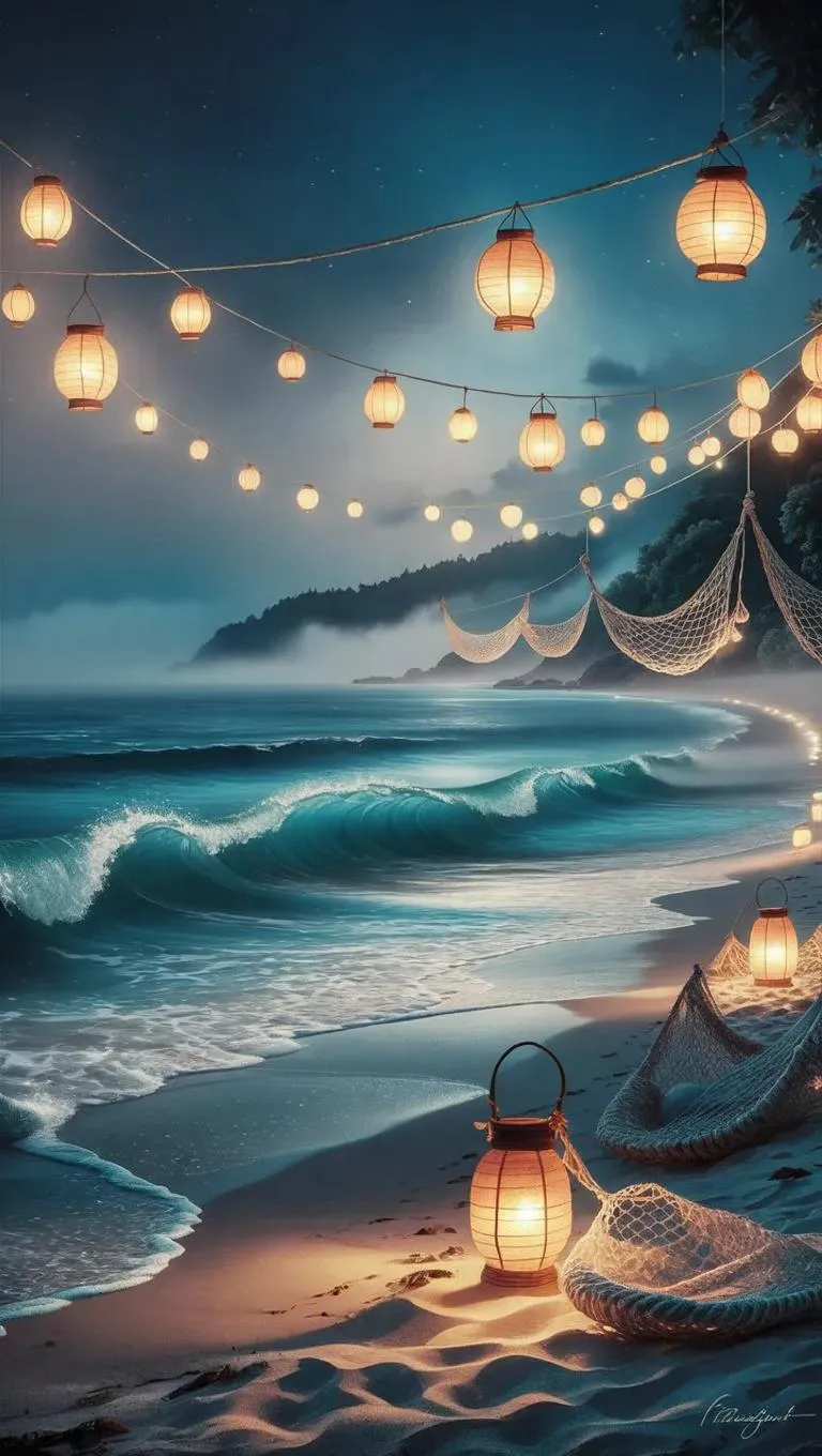 Create a serene beach scene with glowing lanterns by a deep blue sea. Vivago.ai crafts tranquil AI imagery with soft waves, warm lights, and peaceful coastal vibes. Perfect for relaxing visuals, digital art, or calming backgrounds. Use AI tools to enhance tranquility, detail, and color harmony in professional-grade, AI-generated art.