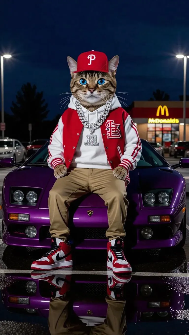 Create anthropomorphic Bengal cat art with blue eyes, styled in streetwear on a purple Lamborghini Diablo SV. Night scene in a McDonald's parking lot featuring reflections, puddles, and shadows. Vivago AI transforms detailed prompts into unique AI-generated imagery.