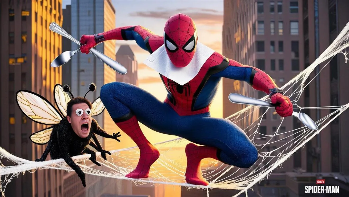 Spiderman crouches dynamically on a glistening spiderweb stretching between skyscrapers, wearing a napkin bib and gripping oversized silver cutlery with a mock-ferocious grin. Trapped in the silk threads below, a panicked man wears a comically bulbous fly costume with oversized wings and googly-eyed antennae, his expression comically horrified. Golden hour lighting casts long shadows across the hybrid cityscape blending hyper-realistic textures with comic-book halftone patterns. The scene balances dramatic superhero framing with absurdist humor - splashes of red and yellow dominate the composition while spaghetti-strand web details catch orange sunset reflections. A faint "SLURP" sound effect floats in the air through visual text elements.