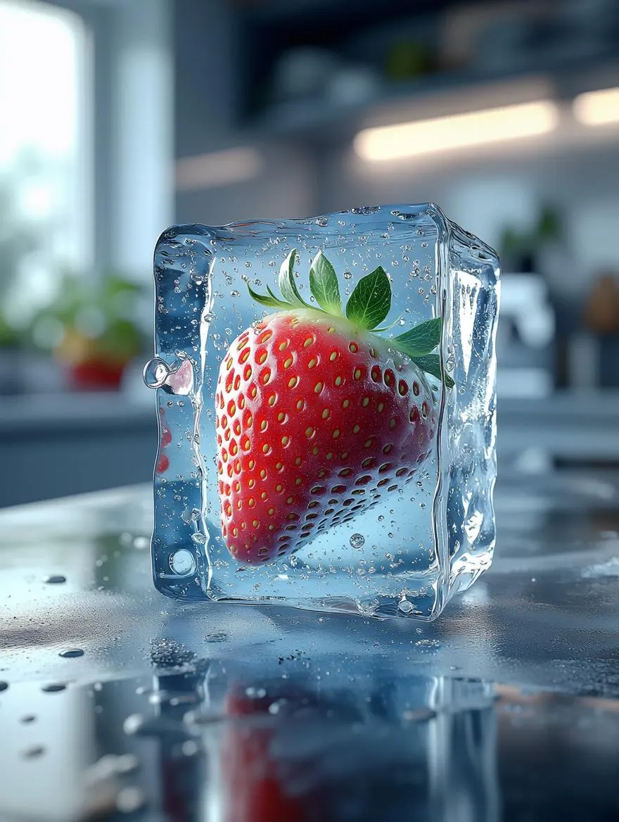 Generate a cinematic, ultra-detailed 3D render of a realistic strawberry trapped in melting ice with scratches, bubbles & textures. Soft diffused lighting & cool-toned palette (blues, white, green) set against a blurred kitchen background. Create fashionable surrealist posters or high-end digital art with VivaGo.ai's AI image generator.