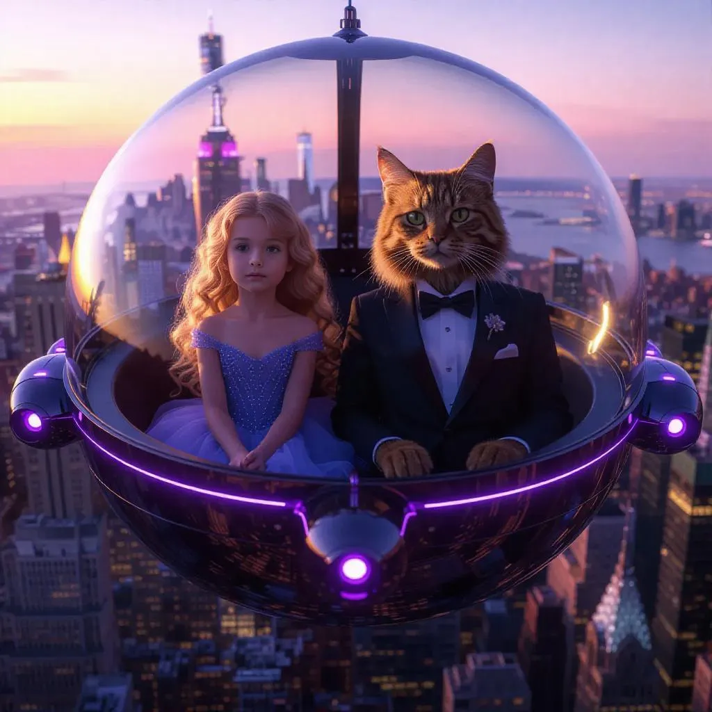 Futuristic AI-generated art of a transparent high-tech capsule with a blonde girl in a blue dress and a red cat-headed man in a tuxedo, overlooking a vast metropolis at sunset. Surreal cityscape with glowing skyscrapers, purple-hued flying machine, and vibrant sunset skies. Create stunning visuals with Vivago.ai's advanced AI effects and image generation tools.
