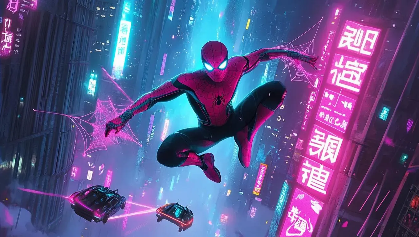 Spiderman leaps between towering skyscrapers in a neon-lit, futuristic city at night. His suit features glowing circuitry patterns, blending techwear with classic Spidey aesthetics. The city is bathed in vaporwave tones of electric blues, hot pinks, purples, and neon greens, with holographic billboards, digital spiderwebs, and vibrant graffiti adorning the buildings. Flying cars zip through the misty skyline, while neon kanji signs and robotic spider drones add to the chaos. Glitch effects, stylized rain, and glowing particles create a sense of motion and energy, blending comic book flair with high-tech dystopia.