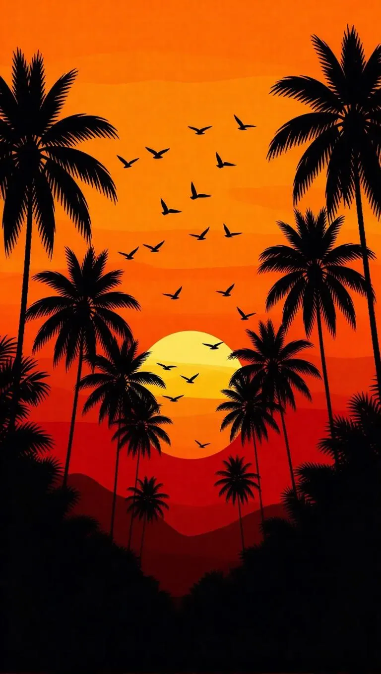 Vibrant oil painting. Medium shot. A big orange sun sets behind black palm trees and birds flying in the distance. Wide shot. Warm color palette. Soft brushstrokes. Golden light on palm trees. Colorful sky with orange hues. Warm glow. Best quality, highly detailed, cinematic, serene landscape, natural beauty, peaceful atmosphere, majestic trees, flying birds, sunset colors.