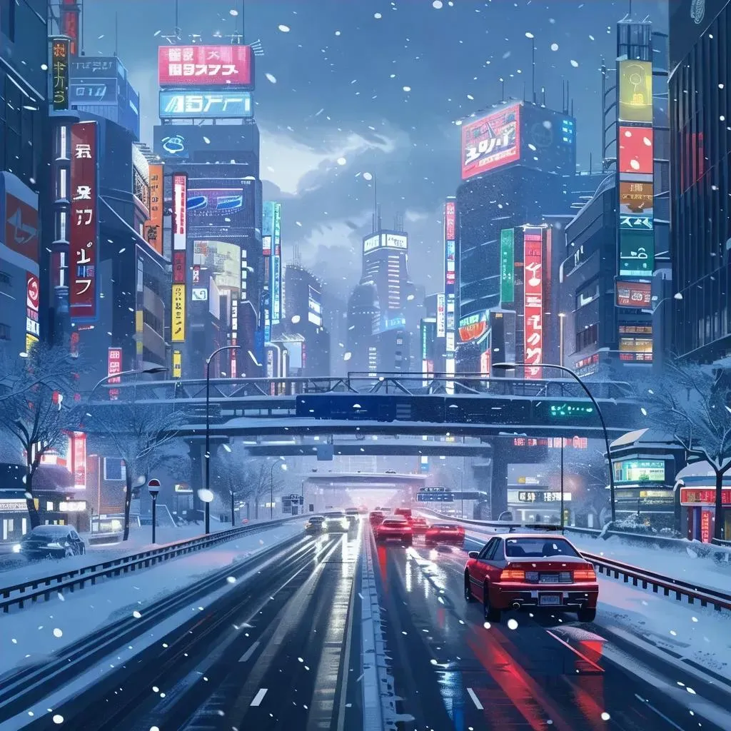 Generate a dynamic anime-cyberpunk scene of a noon snowstorm on a neon-lit highway with vivago.ai's AI tools. Experience eye-level perspectives, futuristic vehicles, and swirling snow effects for immersive, cinematic visuals. Perfect for anime fans and cyberpunk creators seeking hyper-detailed, atmospheric AI-generated imagery.