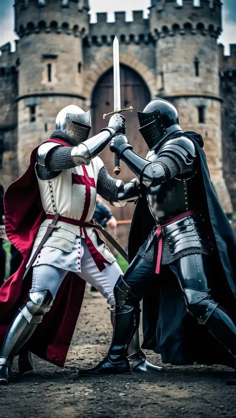 Experience AI-generated medieval battle scenes with vivid detail. Vivago.ai crafts dynamic visuals of two knights clashing in a castle: one in a red-cross white corset, faltering; the other in sleek black armor, triumphant. Elevate your storytelling with text-to-image AI tools, stunning AI effects, and professional editing for epic fantasy art. Create captivating, high-resolution visuals for games, books, or digital projects.