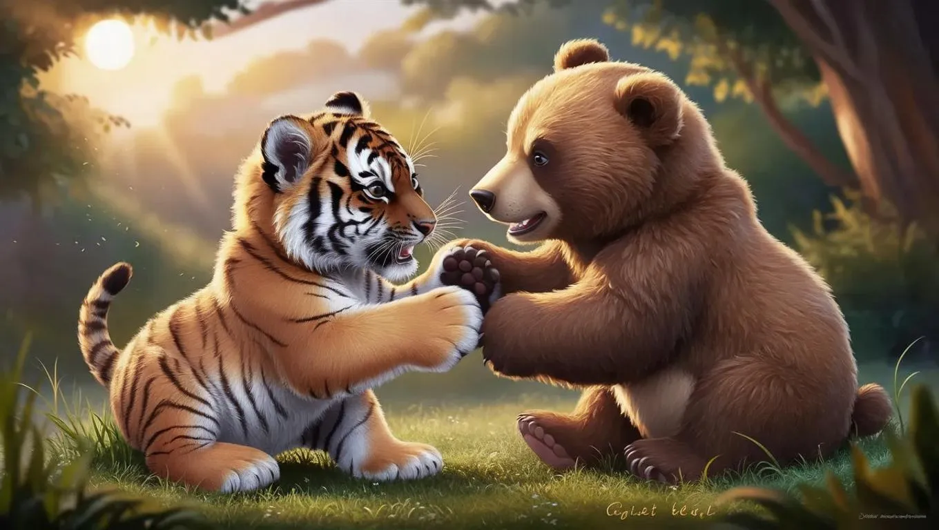 Create an AI-generated playful scene of adorable tiger and bear cubs in a lifelike battle. Use Vivago.ai's AI image tools to transform text prompts into vivid, dynamic visuals. Perfect for crafting whimsical animal encounters with professional-grade effects.