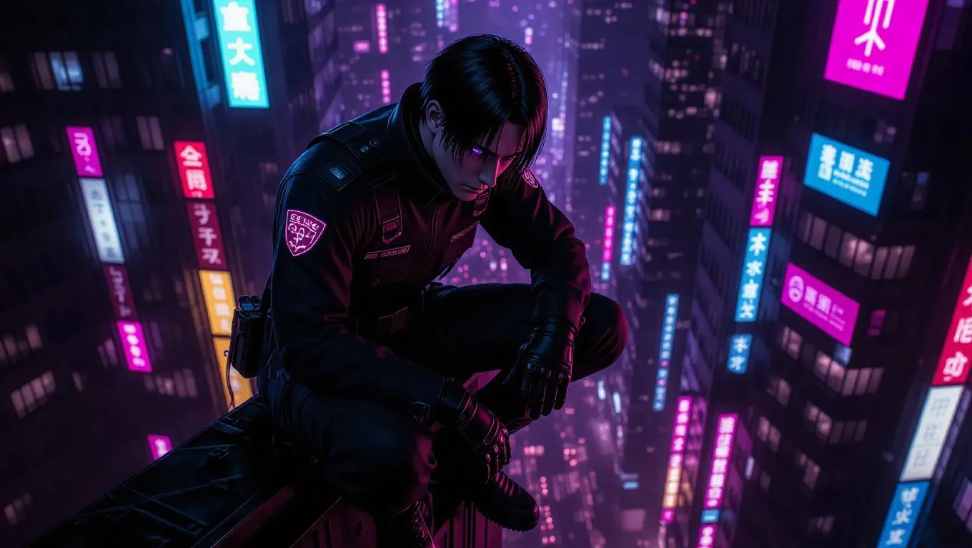 Generate AI-powered cyberpunk digital art of Levi Ackerman in a neon-lit futuristic cityscape. Features glowing omni-directional gear, cybernetic eyes, holograms, flying vehicles, and gritty urban chaos. Ideal for dynamic anime-inspired visuals blending strength and dystopian contrast. Create striking AI art with Vivago.ai's advanced tools.