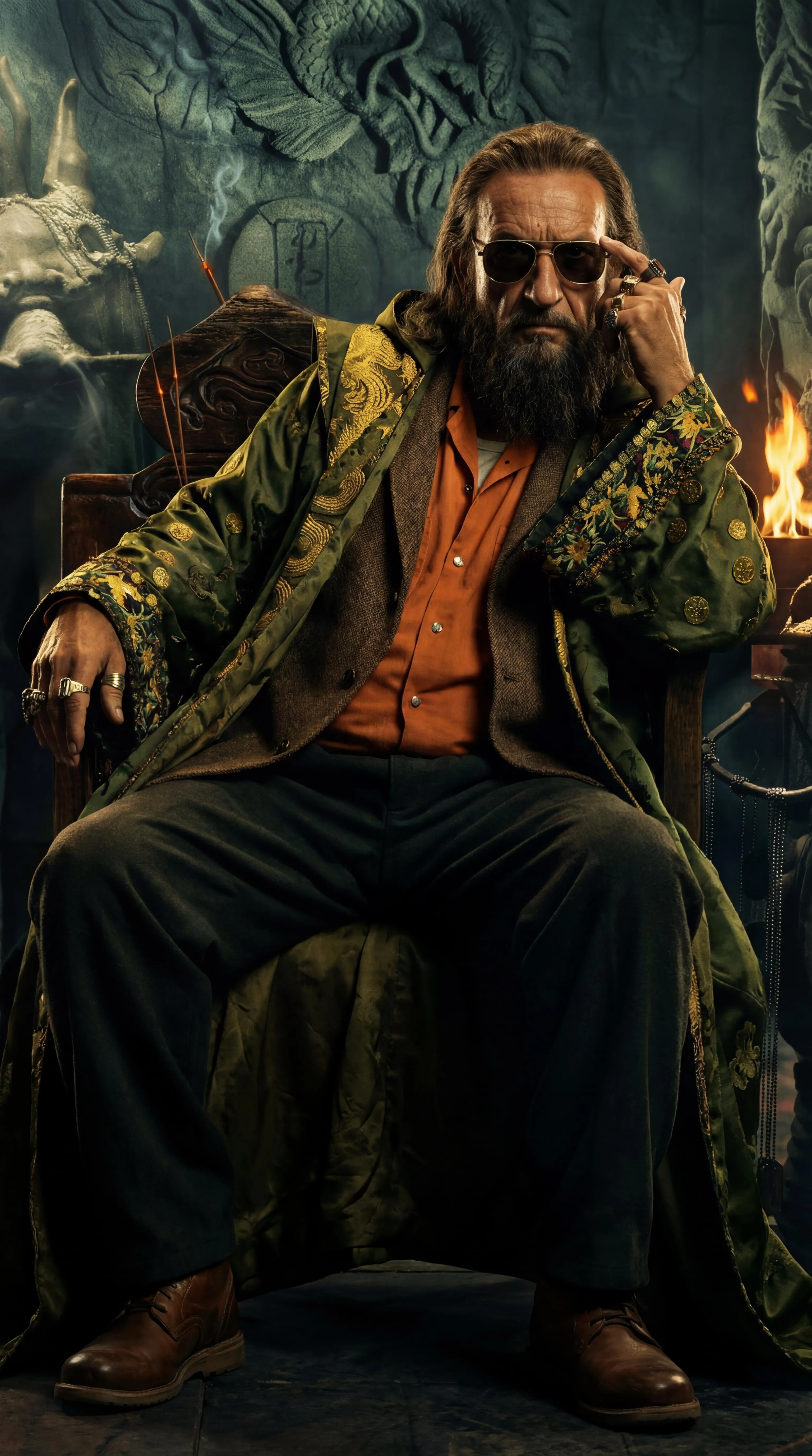 Generate a seamless composite of Trevor Slattery (Ben Kingsley) merging all four iconic looks. AI combines his Iron Man 3 warlord outfit, All Hail the King jumpsuit, Wonder Man sport coat, and Shang-Chi dragon robe. Includes all hairstyles, goatees, sunglasses, and ten rings. Create this complex Marvel character fusion with Vivago.ai's AI image generation.