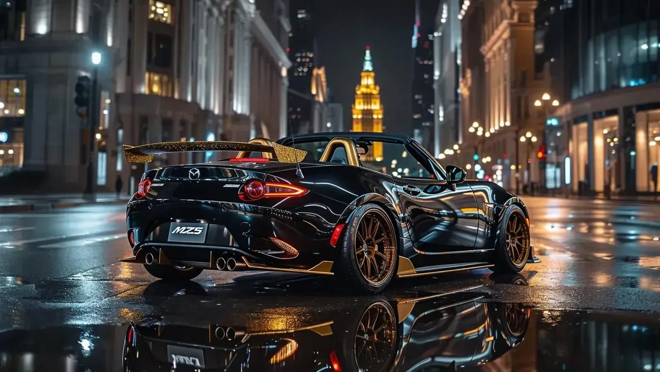 Generate a stunning AI image of a sleek black Mazda MX5 with gold accents in a dark, mysterious cityscape. Ultra-HD 16K resolution captures shimmering details, low visibility drama, and eerie reflections on empty streets. AI-powered tools enhance shadows, diamond highlights, and the car's enigmatic allure for professional-grade visuals. Perfect for cinematic or automotive creative projects.