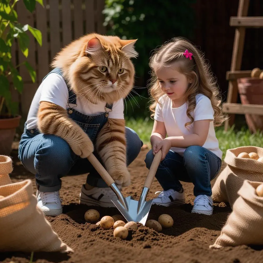 AI-generated image of an anthropomorphic fluffy ginger cat with a human body and a blonde toddler planting potatoes in a garden. High-resolution photo featuring detailed outfits, shovels, potato bags, and buckets. Vibrant scene blending whimsical anthropomorphism with farm activity, created via AI tools for vivid, imaginative visuals. Perfect for creative storytelling or unique digital art projects.