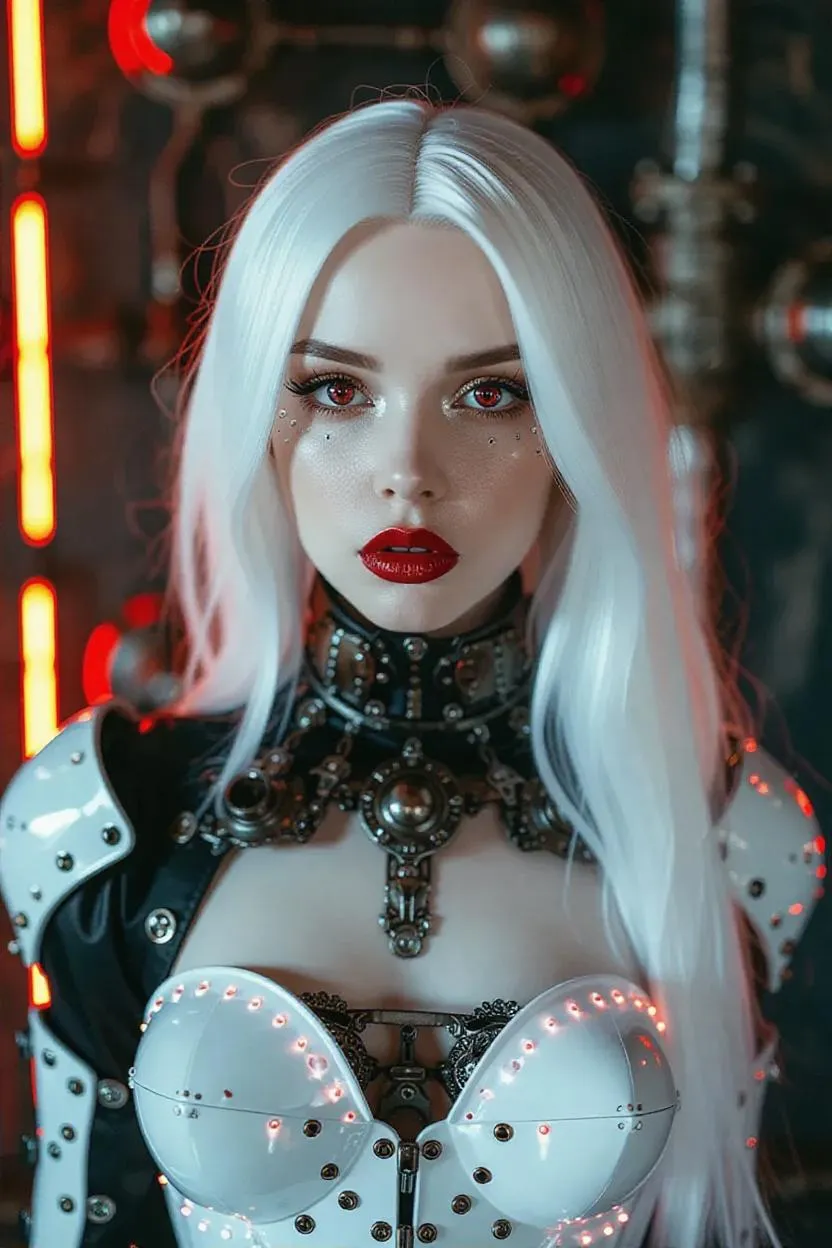 Craft steampunk AI art with Vivago.ai's creative tools. Generate a half-woman, half-robot character featuring white elegant hair, red eyes, and neon accents. Explore photo-realistic steampunk fashion with red lipstick details. AI-powered image generation blends organic-mechanical elements. Create full-body portraits using professional editing effects. Transform ideas into striking retro-futuristic visuals.