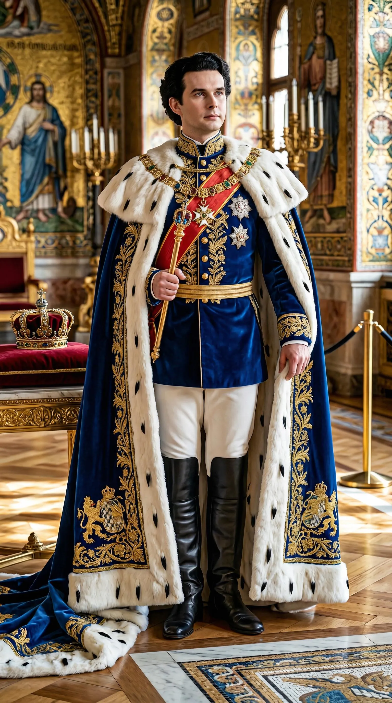 König Ludwig II of Bavaria in a magnificent royal robe, full body, exuding timeless elegance, captured in a modern photograph with crisp details and vibrant colors, reflecting today's high-resolution quality.