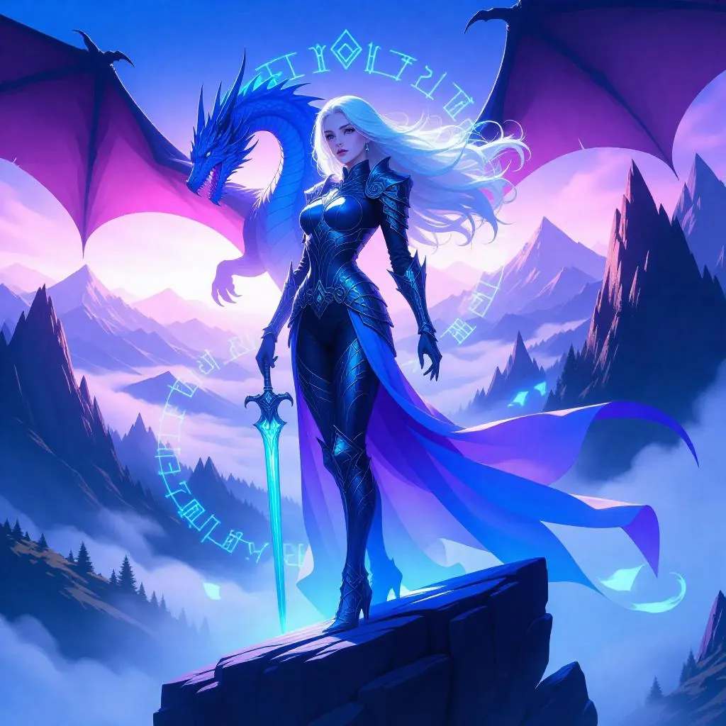 Fantasy realm woman, ethereal and graceful, with flowing silver hair and luminescent skin, adorned in intricate, enchanted armor, standing atop a mist-covered mountain, surrounded by glowing runes and ancient symbols, with a majestic dragon soaring in the twilight sky behind her.