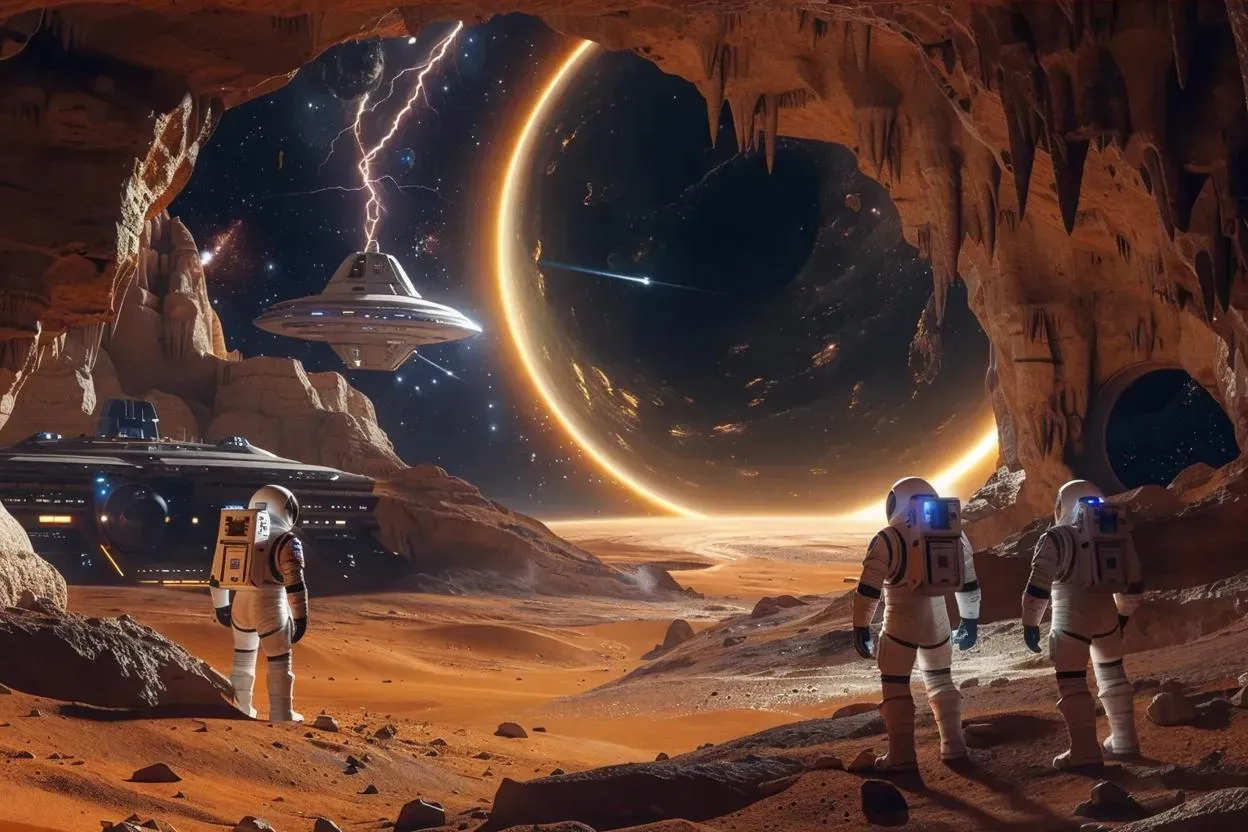 Explore AI-generated sci-fi interiors with Vivago.ai. Transform text into stunning visuals of Atreides-style caves on Gammu Planet, featuring astronauts, spaceships, and a dramatic lightning-blackhole backdrop. Unleash futuristic world-building with AI-powered image generation, blending Dune-inspired aesthetics and cosmic adventure for professional-grade creative projects.