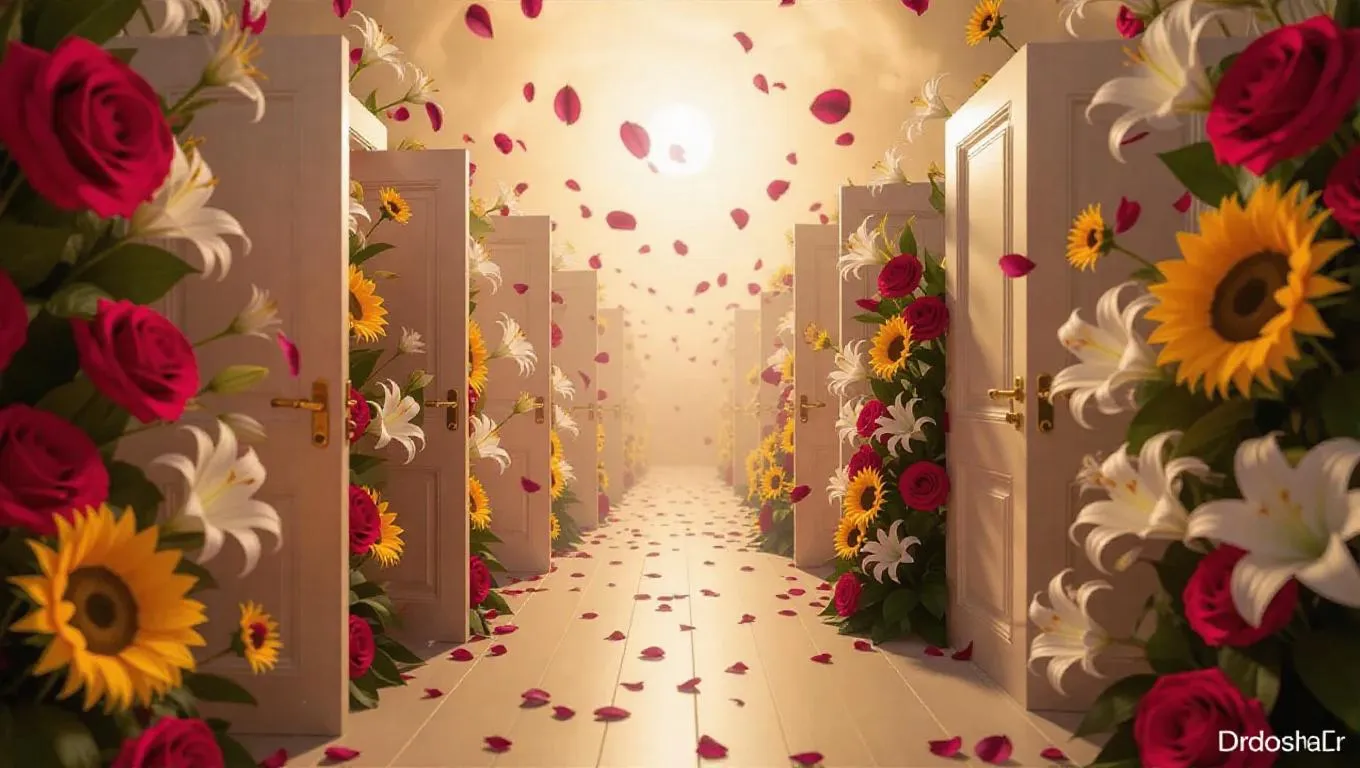 Surreal AI-generated art depicting a dreamlike scene of doors opening in an ethereal space, revealing vibrant roses, lilies, and sunflowers. Hyper-detailed fantasy realism captures floating petals in golden light, dynamic spiral composition, and cinematic floral cascade. Magical realism visuals blend with cinematic grandeur for mesmerizing, professional-grade creative transformations.