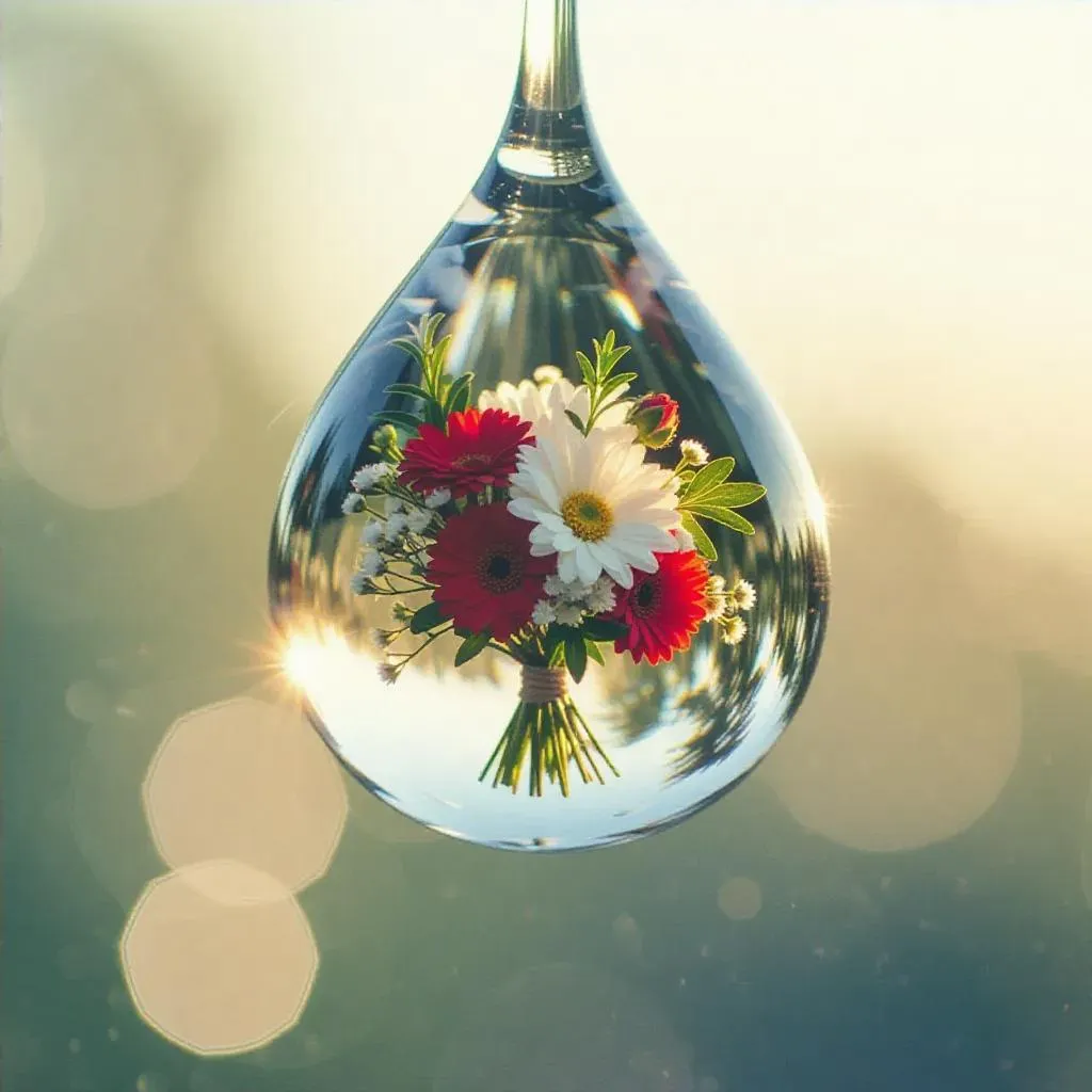 Discover AI-generated cross-processed vintage film photography with vivago.ai. Capture a surreal water droplet suspended mid-air, revealing a vibrant floral bouquet in lush greens, radiant reds, and wispy whites. Soft creamy bokeh, golden lighting, and 135mm lens precision enhance this dreamlike scene. Perfect for realistic, rule-of-thirds compositions in indoor settings.