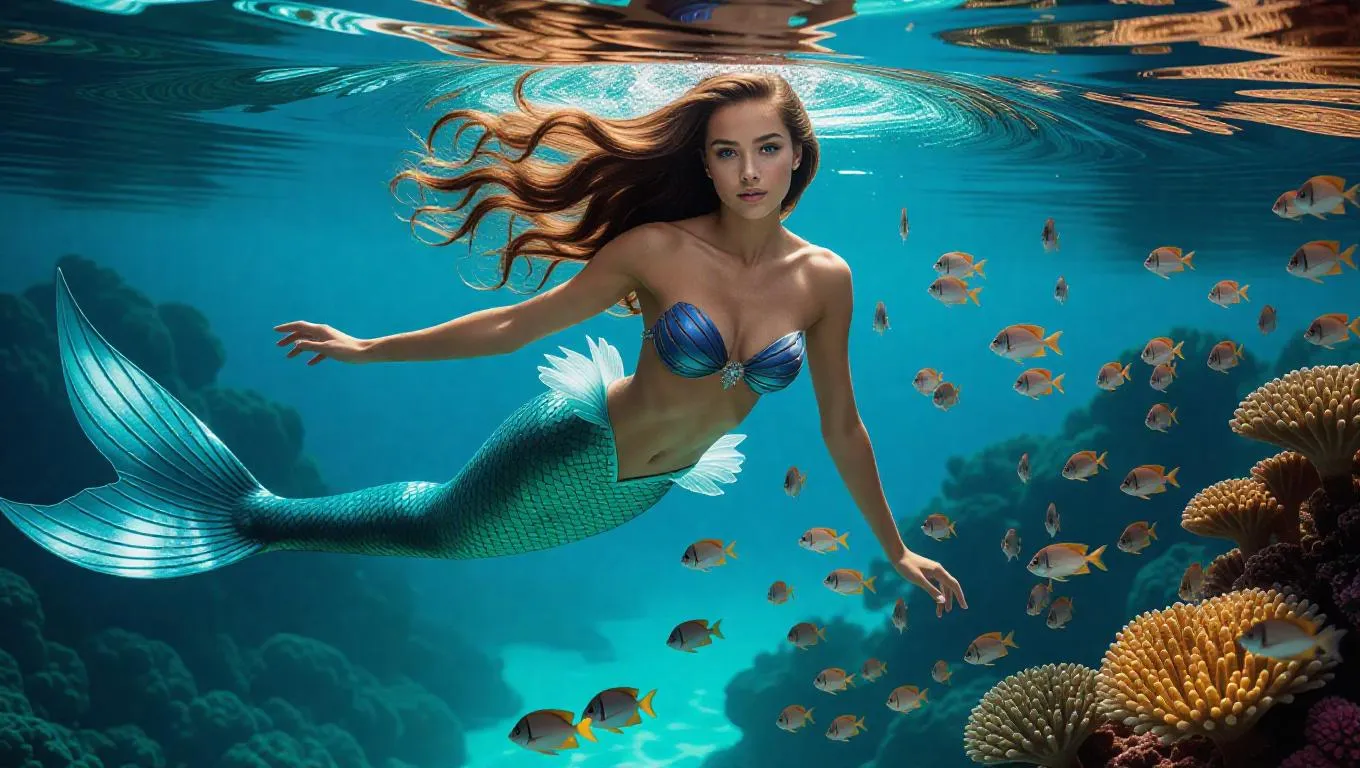 Enthroned in an ethereal underwater kingdom, a stunning mermaid floats gracefully, her flowing hair intertwined with tranquil currents. Her enigmatic gaze pierces through crystal-clear blue waters, surrounded by vibrant marine life. Tropical fish weave through lush coral gardens, creating a serene, colorful tapestry that invites awe and wonder.