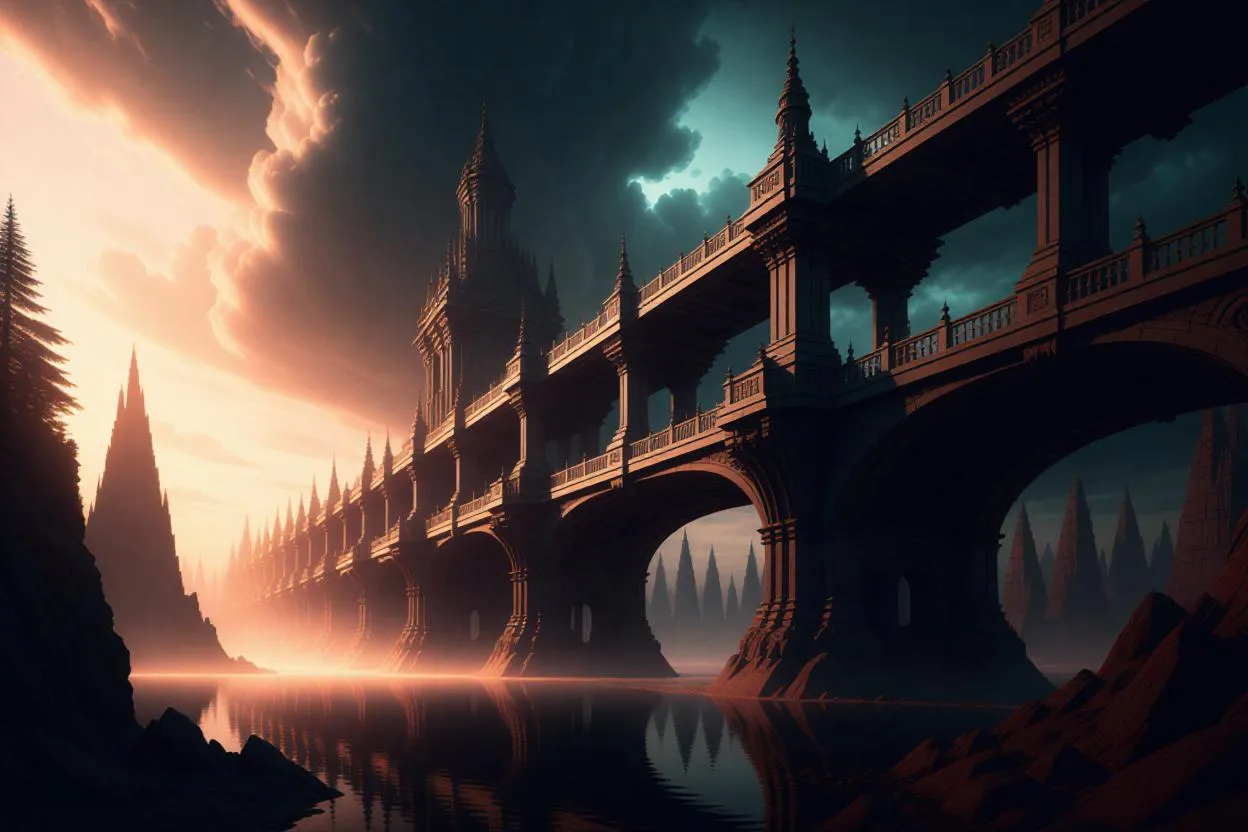 Generate a stunning AI-powered futuristic cityscape with dramatic stone bridges, sunset-lit skies, and mysterious atmospheres. Explore VivaGo's AI tools for dark, immersive digital art, transforming text prompts into professional-grade visuals with layered details, glowing effects, and ominous urban landscapes. Ideal for concept art and mood-driven storytelling.