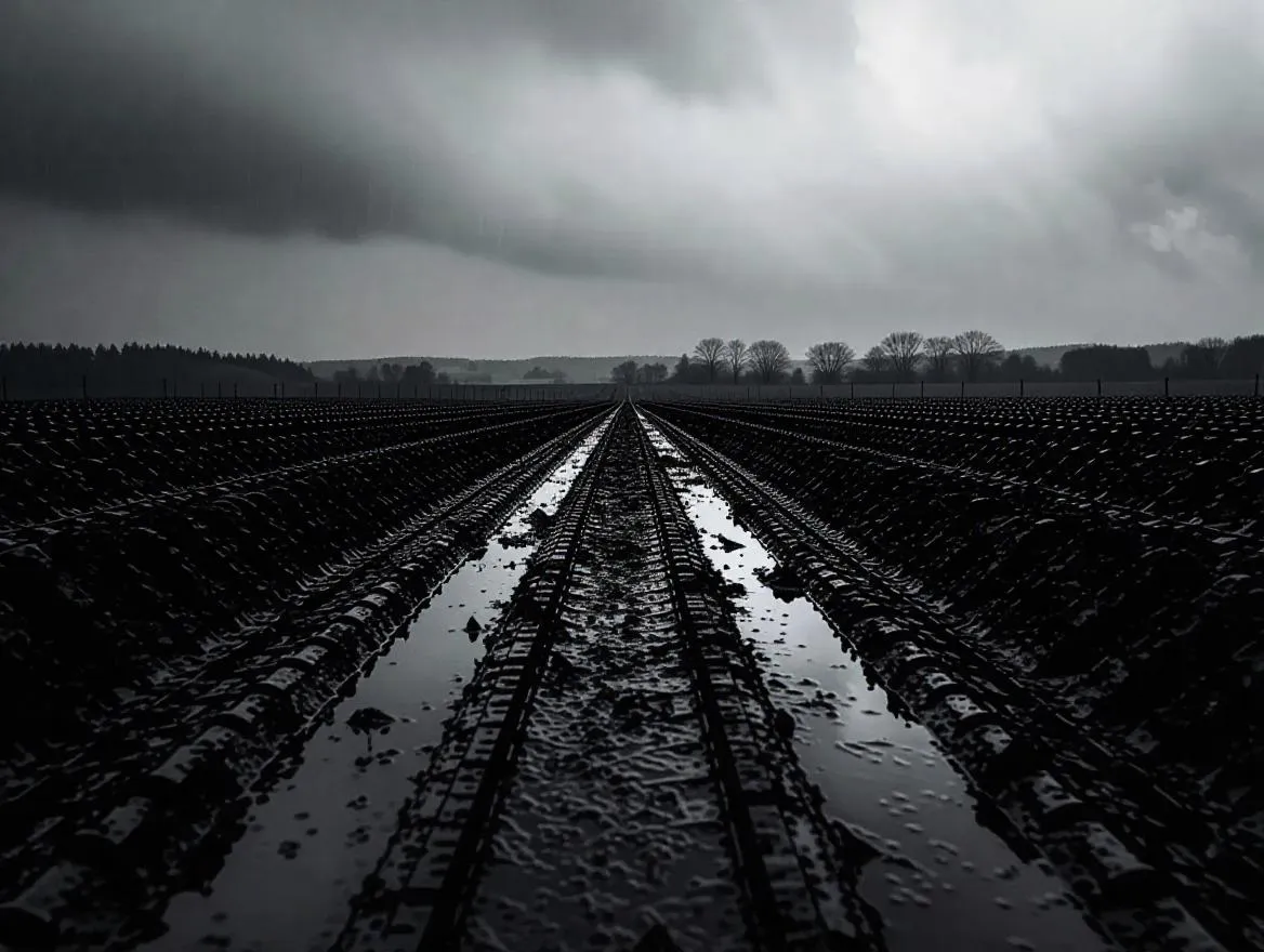 Craft a haunting black metal album cover with AI, inspired by Béla Tarr's Satantango. Generate endless rain-soaked muddy fields in washed-out monochrome, evoking existential dread. Perfect for atmospheric metal bands seeking AI-generated visuals that blend cinematic bleakness, raw texture, and minimalist composition for maximum emotional impact.