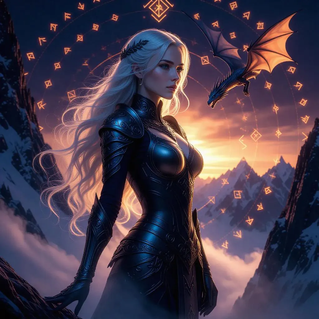 Fantasy realm woman, ethereal and graceful, with flowing silver hair and luminescent skin, adorned in intricate, enchanted armor, standing atop a mist-covered mountain, surrounded by glowing runes and ancient symbols, with a majestic dragon soaring in the twilight sky behind her.