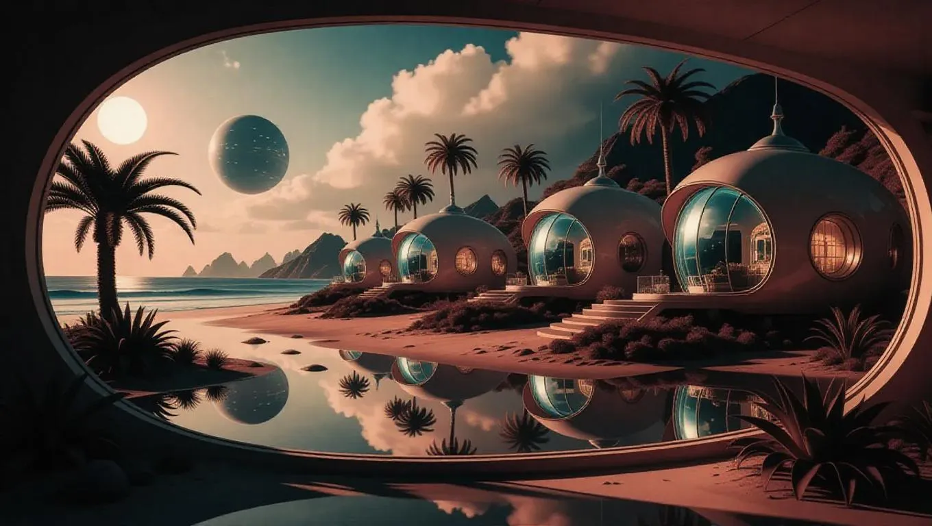 High quality, 8K, Ultra HD, Highly detailed, High contrast, Perfect Cinematic photo, Photorealistic Retro-futuristic 1950's sci-fi magazine style alien resort village interior, Large windows framing beachside setting on an alien planet, Alien houses with polished glass and porcelain, Alien plants with intricate anatomical designs, Alien sky with glowing cybernetic elements, Water puddles reflecting vibrant citrine hues, Stunning landscape, Accurate lighting, Richly detailed environment, Octane render, Cable electric wires, --ar 3:4 --s 350 --v 6.0
